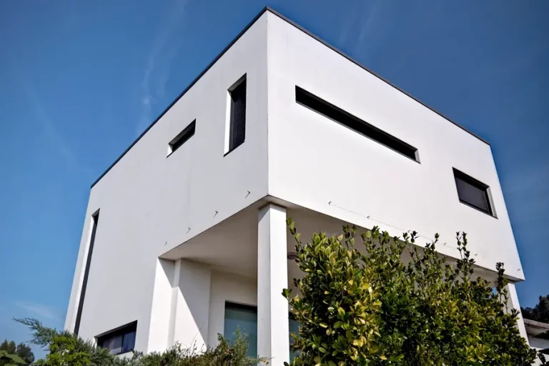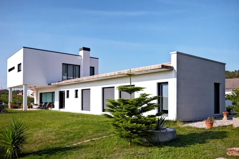 Construida con sillería de 12 cm de espesor, silvestre parga, enfoscado y pintado, carpintería de aluminio y cubierta plana transitable y no transitable.